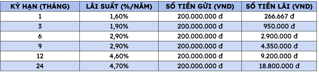 在越南外貿銀行(Vietcombank)存入 2 億越南盾,不同期限的存款利率分別為多少?